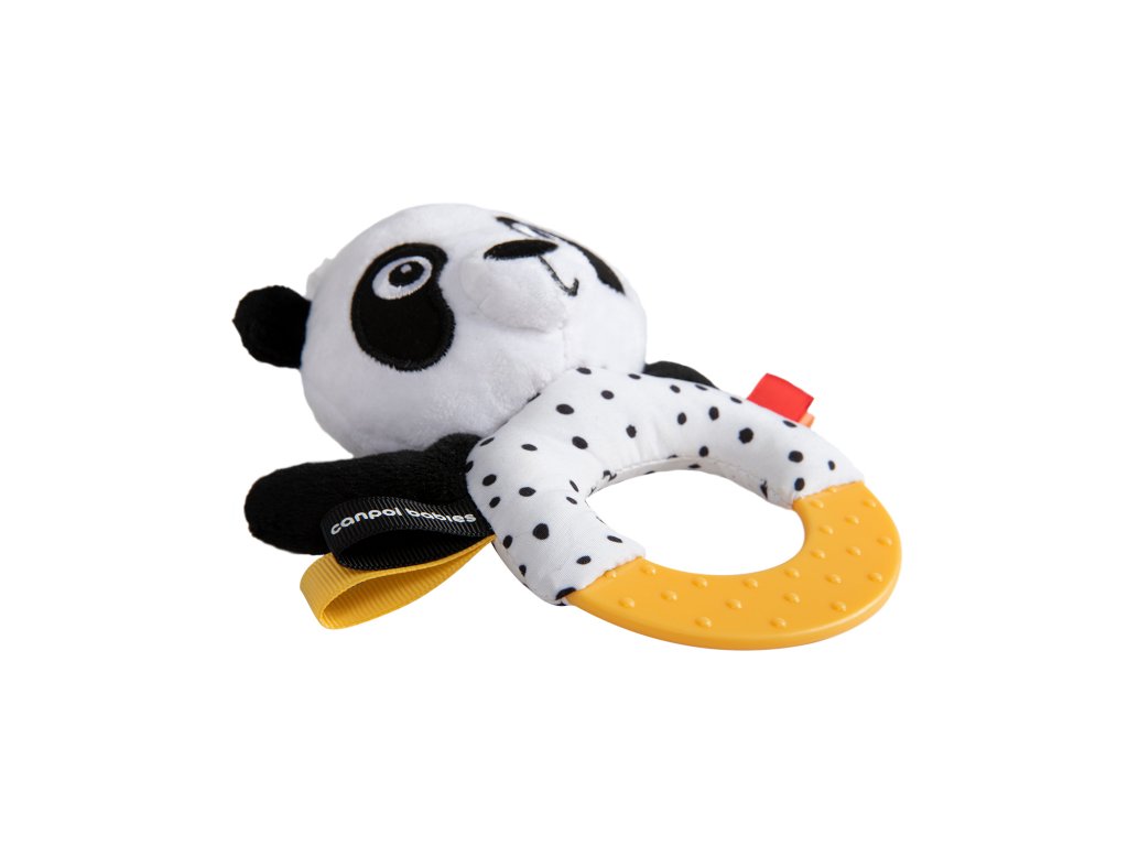 Hračka je lehká a pohodlná na uchopení a držení v malých dětských ručičkách. Při zatřesení vydává jemné, příjemné zvuky. Měkké žluté kousátko s nopky masíruje dásně a zmírňuje svědění při prořezávání zubů. Na dotek příjemný materiál a přívětivá tvář pandy s kontrastními barvami přitahují pozornost dítěte, stimulují smysly a podporují jejich rozvoj - zraku, sluchu a hmatu. Všité barevné štítky a zrníčka v tlapkách navíc stimulují smysly dítěte.