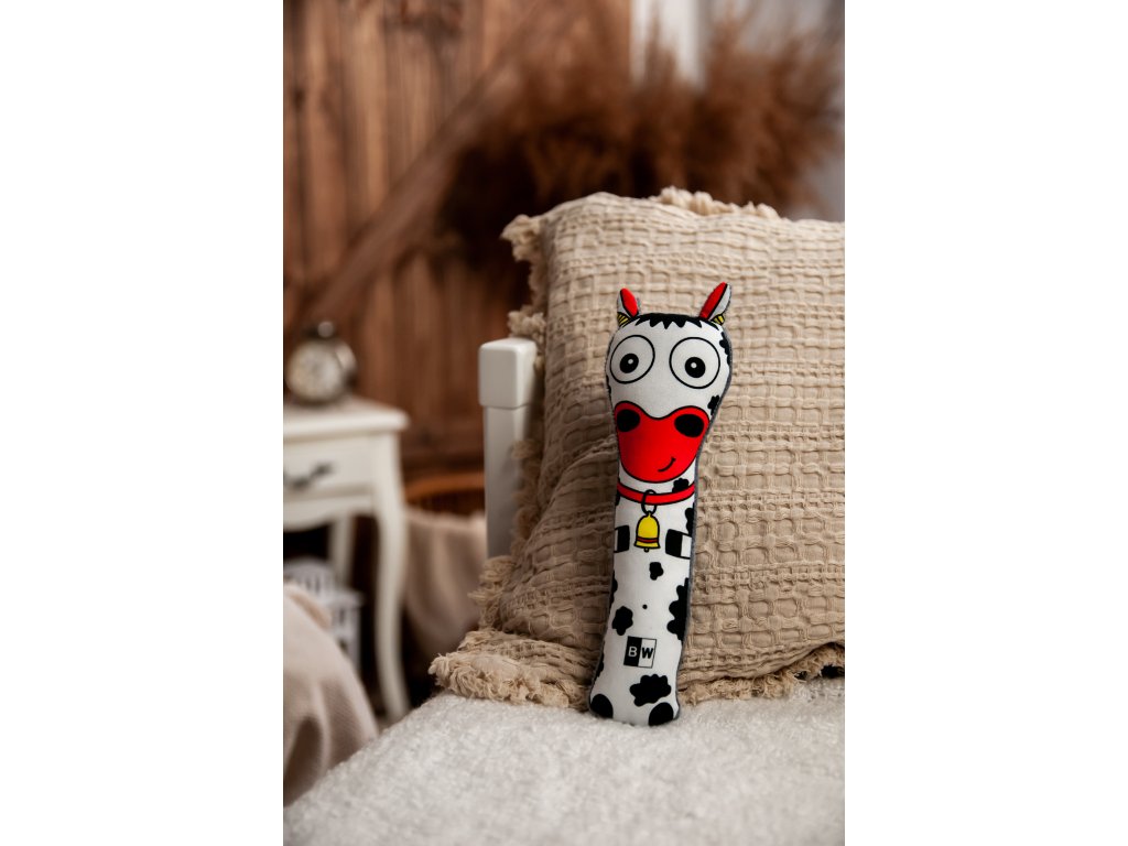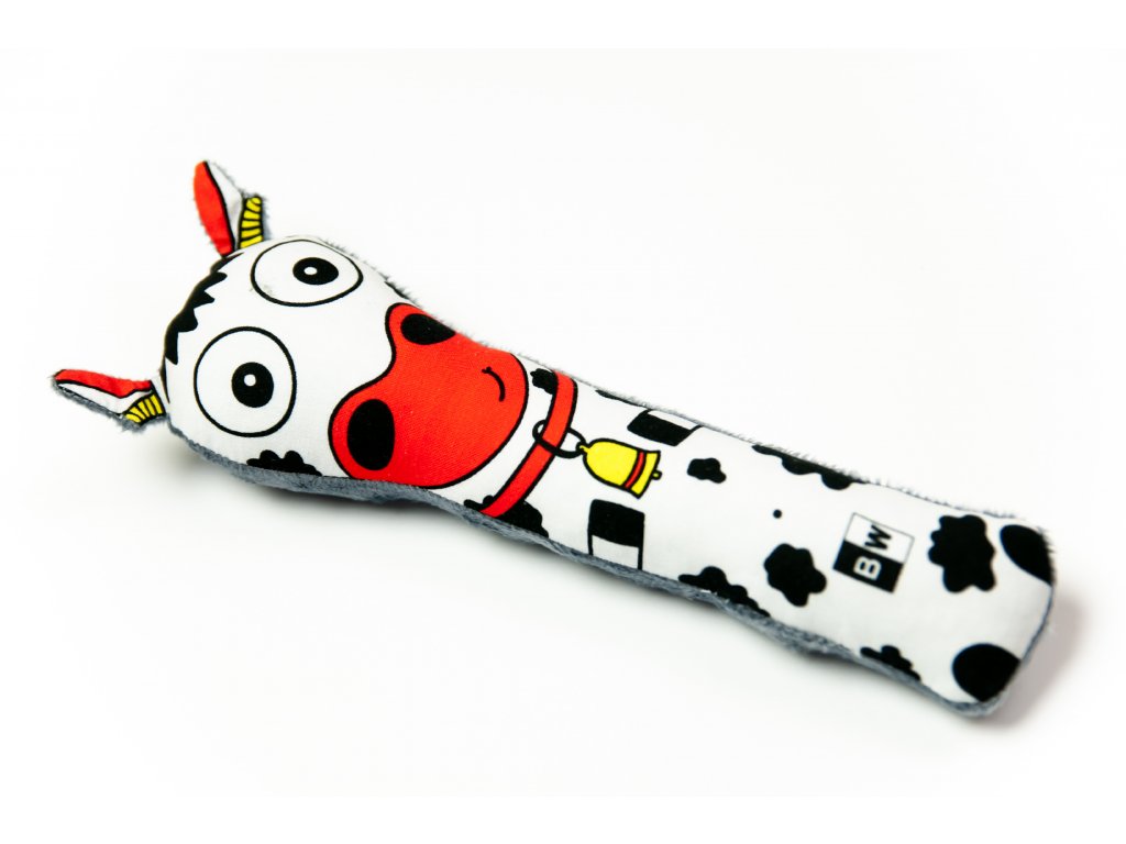 Jemné chrastítko a šustící prvky (atestováno) stimulují jeho sluch. Svým tvarem a velikostí je ideální do dětských ručiček a pomáhá v rozvoji motoriky. Na zadní straně má navíc všité poutko, díky kterého chrastítko pohodlně připevníte na hrazdičku, do kočárku nebo autosedačky.