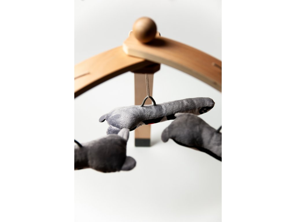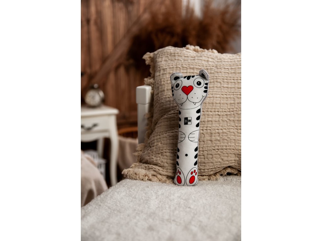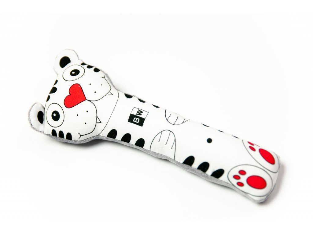 Jemné chrastítko a šustící prvky (atestováno) stimulují jeho sluch. Svým tvarem a velikostí je ideální do dětských ručiček a pomáhá v rozvoji motoriky. Na zadní straně má navíc všité poutko, díky kterého chrastítko pohodlně připevníte na hrazdičku, do kočárku nebo autosedačky.