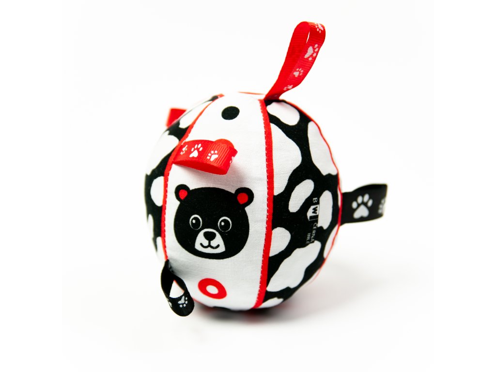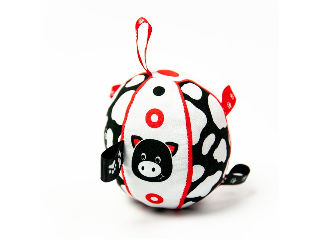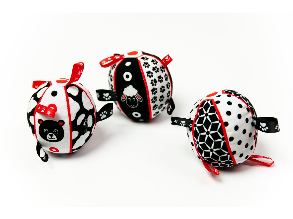 Jemné chrastítko stimuluje sluch (atestováno). Míčky lze díky všitým stužkám připevnit na hrazdičku, do kočárku nebo autosedačky. V sadě jsou vždy 3 kusy míčků. Využitelné budou po dlouhou dobu ke kutálení, ke hře na dece apod.