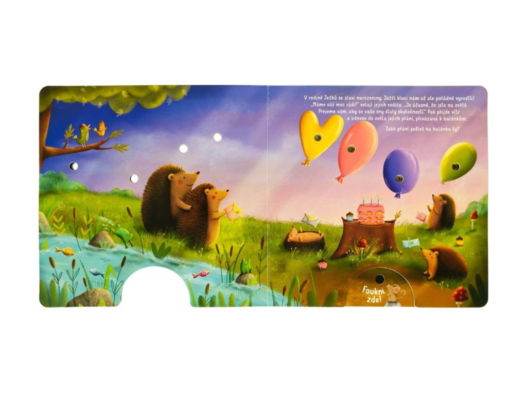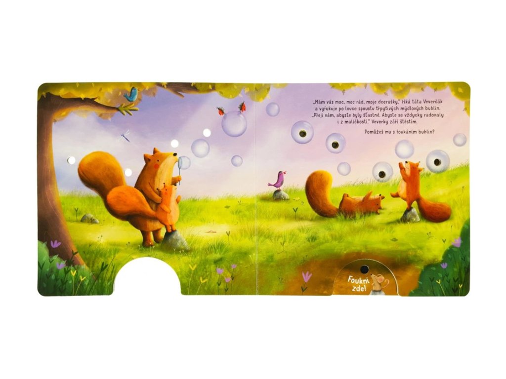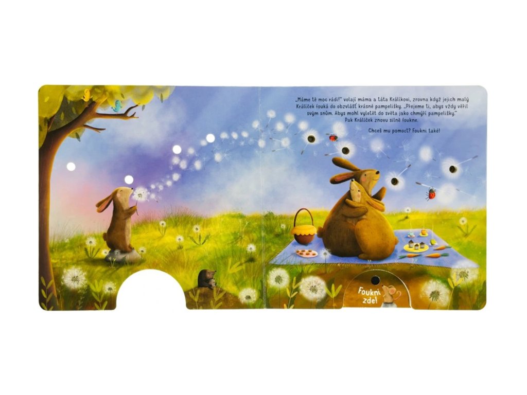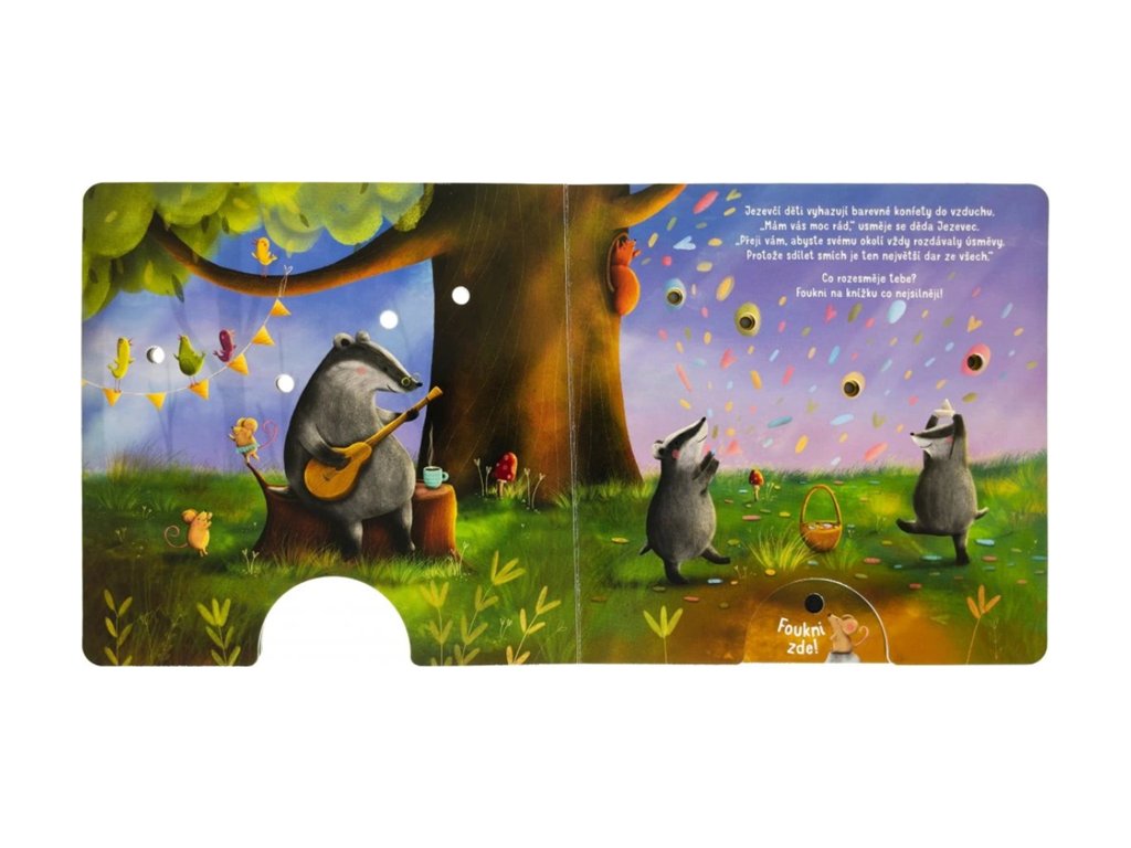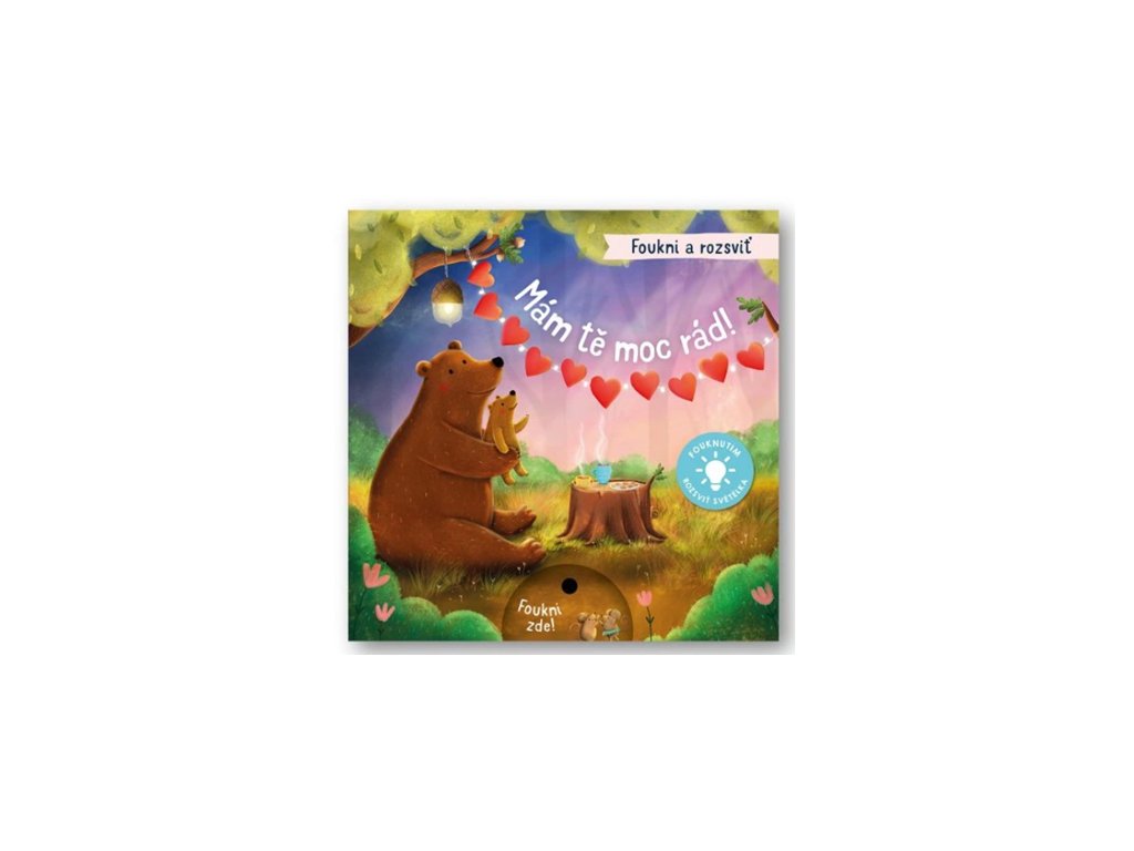 Foukni, rozsviť, počti si - fouknutím rozsviť světélka. Zvířátka v lese se mají moc ráda, v rodinách i mezi přáteli. Děda Jezevec hraje na kytaru svou oblíbenou píseň, aby potěšil vnoučata. Děti vesele tančí do rytmu a těší se z padajících konfet. A maminka Liška? Rozzáří hvězdy na obloze pro svou malou Lištičku. Má ji moc ráda! Foukni na knížku a nechej také rozzářit světélka!
