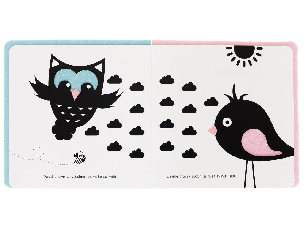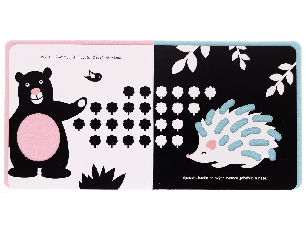 Kočka má pěkný ocásek, moudrá sova velké oči, ježek zase záda plná bodlin. Nechte batolata prozkoumat pomocí prstíků měkké cestičky v této knížce. Knížka je v základu černobílá, s kontrastními ilustracemi pro zdravý rozvoj zraku. Ale protože je složena z více materiálů, obsahuje i další jemnou barvu a je příjemná na dotyk. Děti se při jejím prohlížení seznámí se spoustou hravých zvířátek!