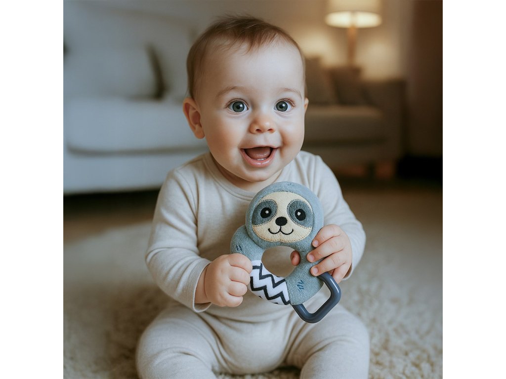 Objevte kouzlo společných chvil a rozvíjejte smysly svého dítěte s plyšovým chrastítkem do ruky s motivem lenochoda z kolekce Sloth Toys značky New Baby.