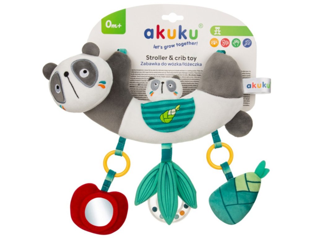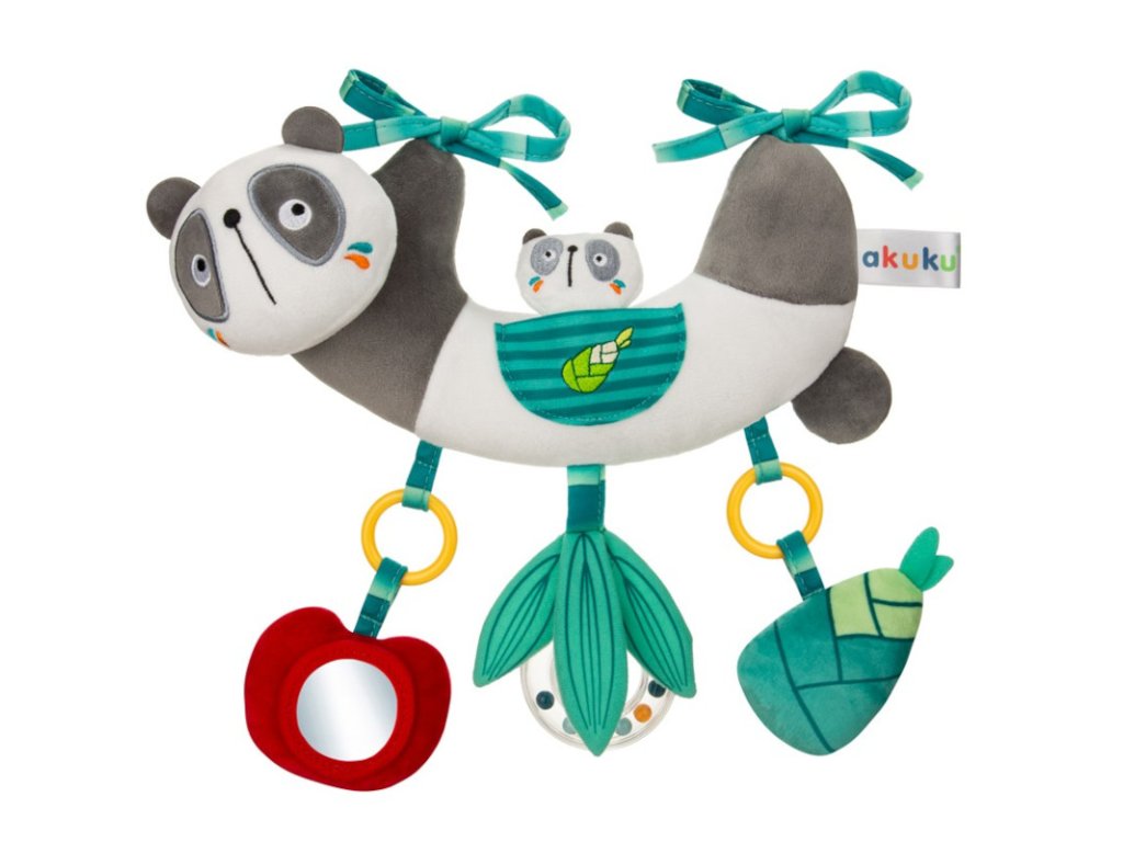 Panda a její malá kamarádka – roztomilá panda a malá panda v kapse jsou skvělým kamarádem, který potěší vaše dítě. Snadno se zavěšuje – hračka má stužky, které umožňují snadné zavěšení do kočárku, postýlky nebo na hrazdu.